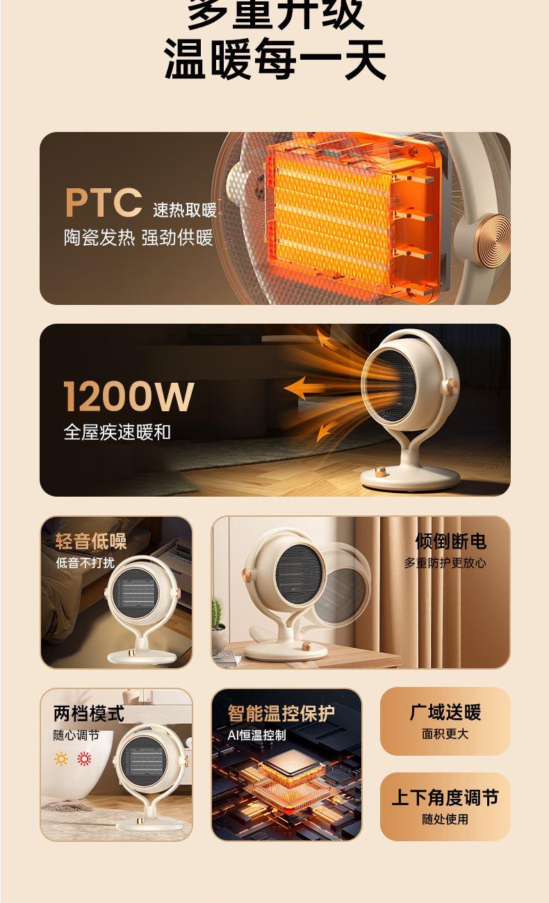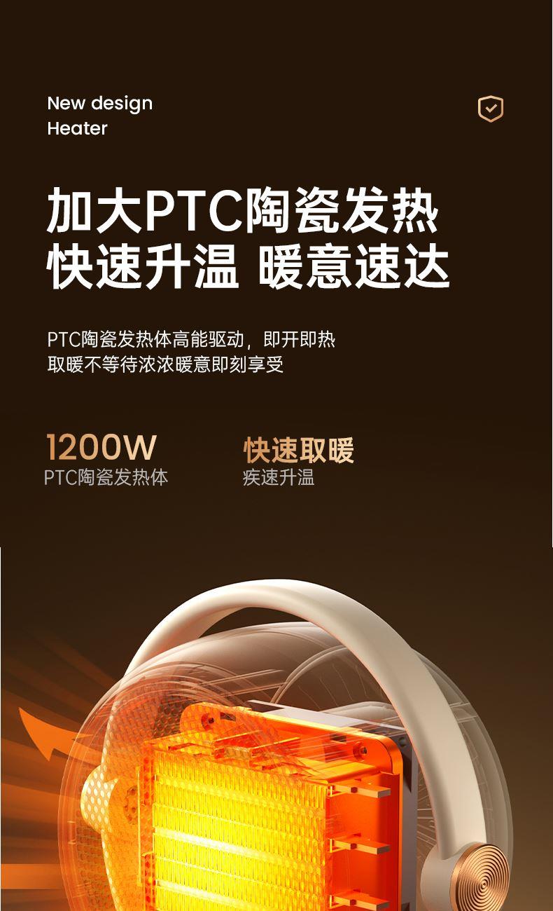 加大PTC陶瓷1200W強(qiáng)速制熱:大功率陶瓷發(fā)熱體,無(wú)光發(fā)熱不刺眼,開(kāi)機(jī)即熱不等待,快速驅(qū)散寒意,暖感直達(dá)全身?