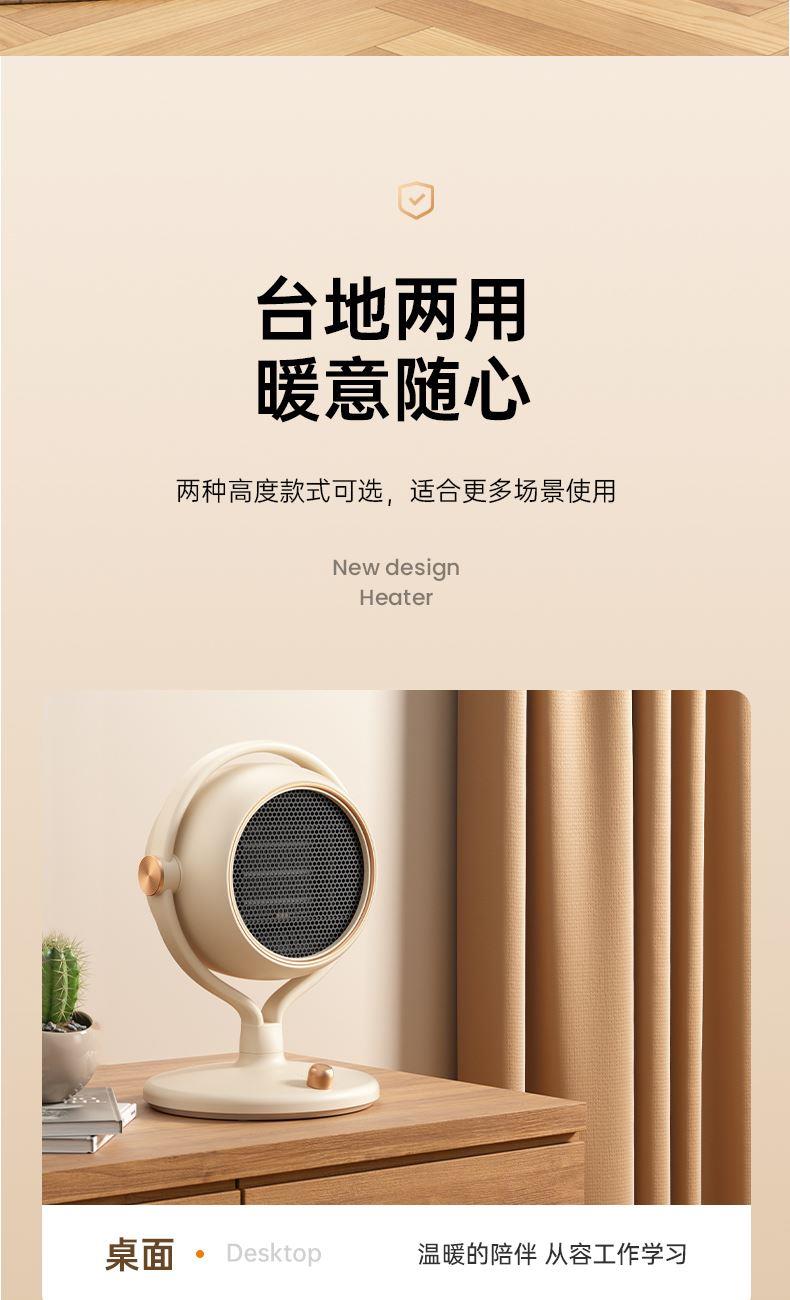 低噪靜音運(yùn)行:工作時(shí)噪音30-40分貝,不打擾休息、辦公,取暖同時(shí)保持環(huán)境安靜提。手式便攜設(shè)計(jì):機(jī)身自帶提手,重量輕、易搬運(yùn),臥室、客廳、辦公室之間靈活移動(dòng)? 360° 上下自由調(diào)節(jié):機(jī)身可 360° 上下轉(zhuǎn)動(dòng),熱氣方向隨心控,無(wú)論是伏案辦公暖手、久坐追劇暖腿,還是睡前暖床,都能對(duì)準(zhǔn)需求,避免熱氣浪費(fèi) 臺(tái)放 + 地用雙模式自由切換:無(wú)需復(fù)雜組裝,輕松切換桌面擺放與地面使用 —— 臺(tái)放時(shí)可置于書(shū)桌、床頭柜,暖手暖腳;地用時(shí)可放在客廳、臥室角落,向周圍擴(kuò)散暖風(fēng),小戶型、大空間都能靈活適配,告別 “一臺(tái)機(jī)器一處用” 的局限