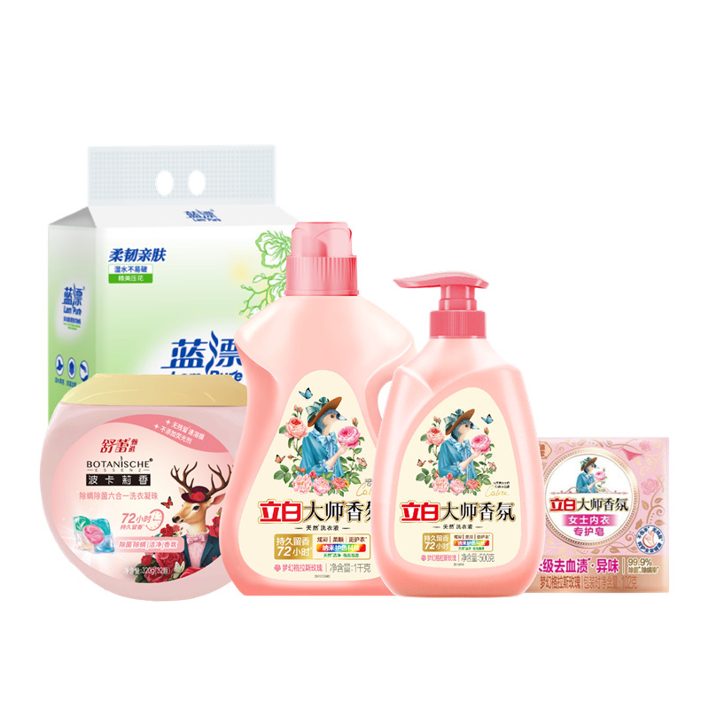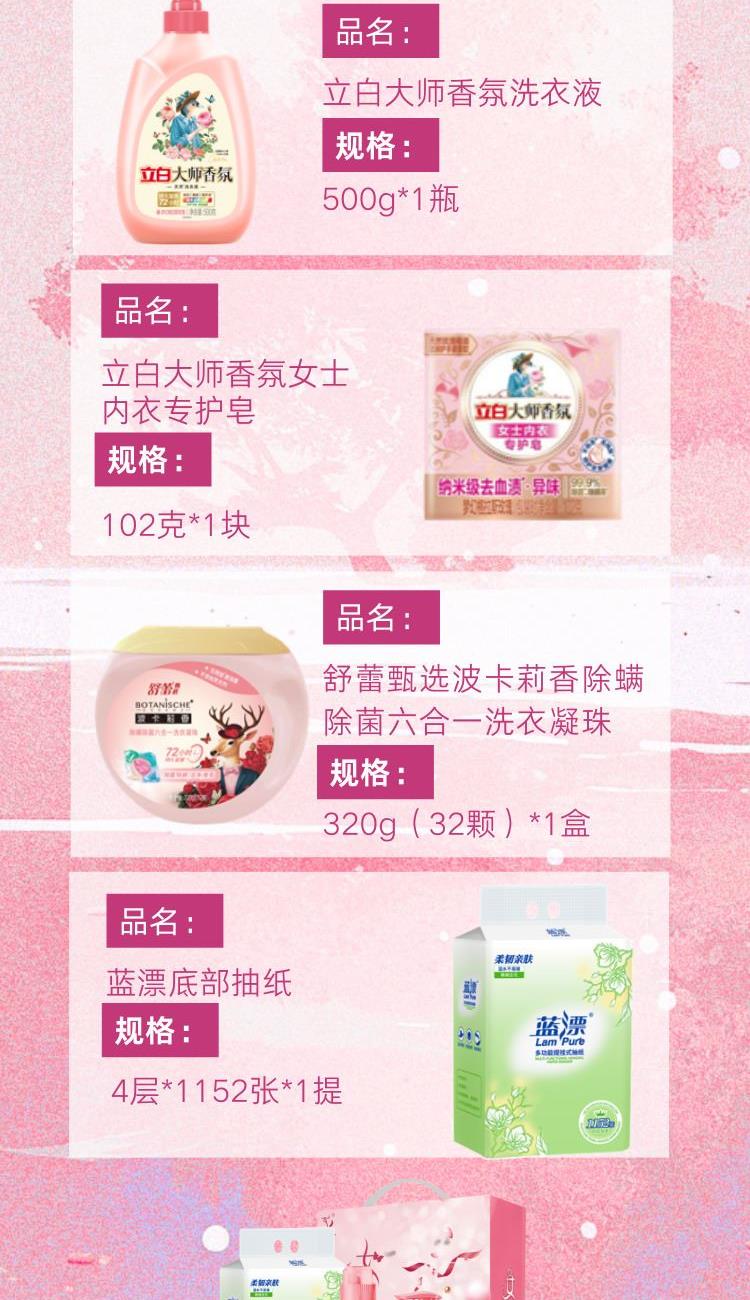 配置: 立白大師香氛洗衣液1kg*1瓶 立白大師香氛洗衣液500g*1瓶 立白大師香氛女士內(nèi)衣專護皂102克*1塊 舒蕾甄選波卡莉香除螨除 菌六合一洗衣凝珠-320g(32顆)*1盒 藍漂底部抽紙4層*1152張*1提 核心賣點: 可選產(chǎn)品豐富多樣,禮箱隨心組合,多種價位因需而定,充分滿足各種送禮需求,是商務(wù)送禮、單位福利的用心之選。